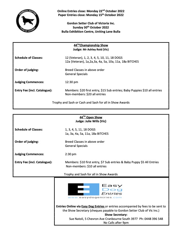 2022 Championship and Open Show Schedules October 3, 2022 The PDF version of the schedules can be found on our Events & Activities page Share this: Click to share on X (Opens in new window) X Click to share on Facebook (Opens in new window) Facebook Like Loading...